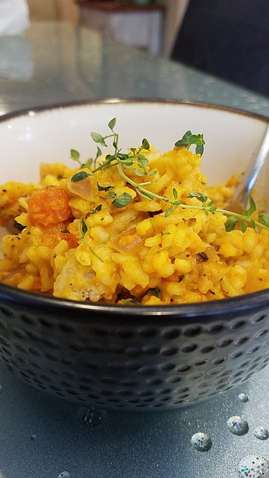 Preheat oven to 425 F. Prep and take out ALL of your ingredients. Risotto does not wait for you 🙂 so it is important to get everything ready first. Measure out: Risotto. Wine. Water. Take out of your cupboard: tahini, nutritional yeast, salt pepper and cayenne. You will also need a food processor or blender. Get that out as well. Chop your carrots into evenly shaped match sticks. Place in a bowl. Add 1 TBSP of olive oil. And a nice chopped handful of fresh thyme. I had some lemon thyme on hand so I used that. Spread on a cookie sheet covered with parchment paper. Sprinkle with salt / pepper. place in oven. Cook for 20 min, remove 1/2 to make a sauce for your Risotto. Place remaining carrots in oven for 5 or 10 more minutes until fully roasted. Remove.