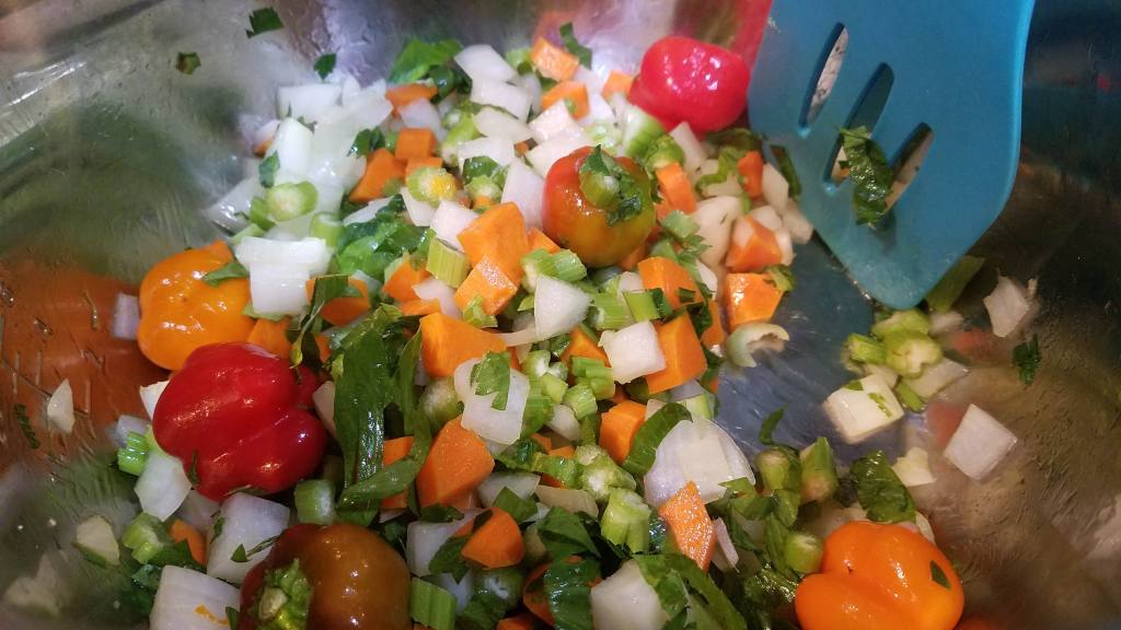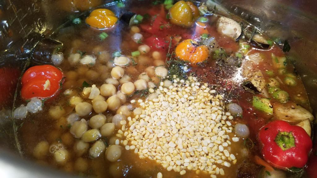 - Add olive oil to insta pot along with veggies. Set to “Saute setting” Cook for 5 min